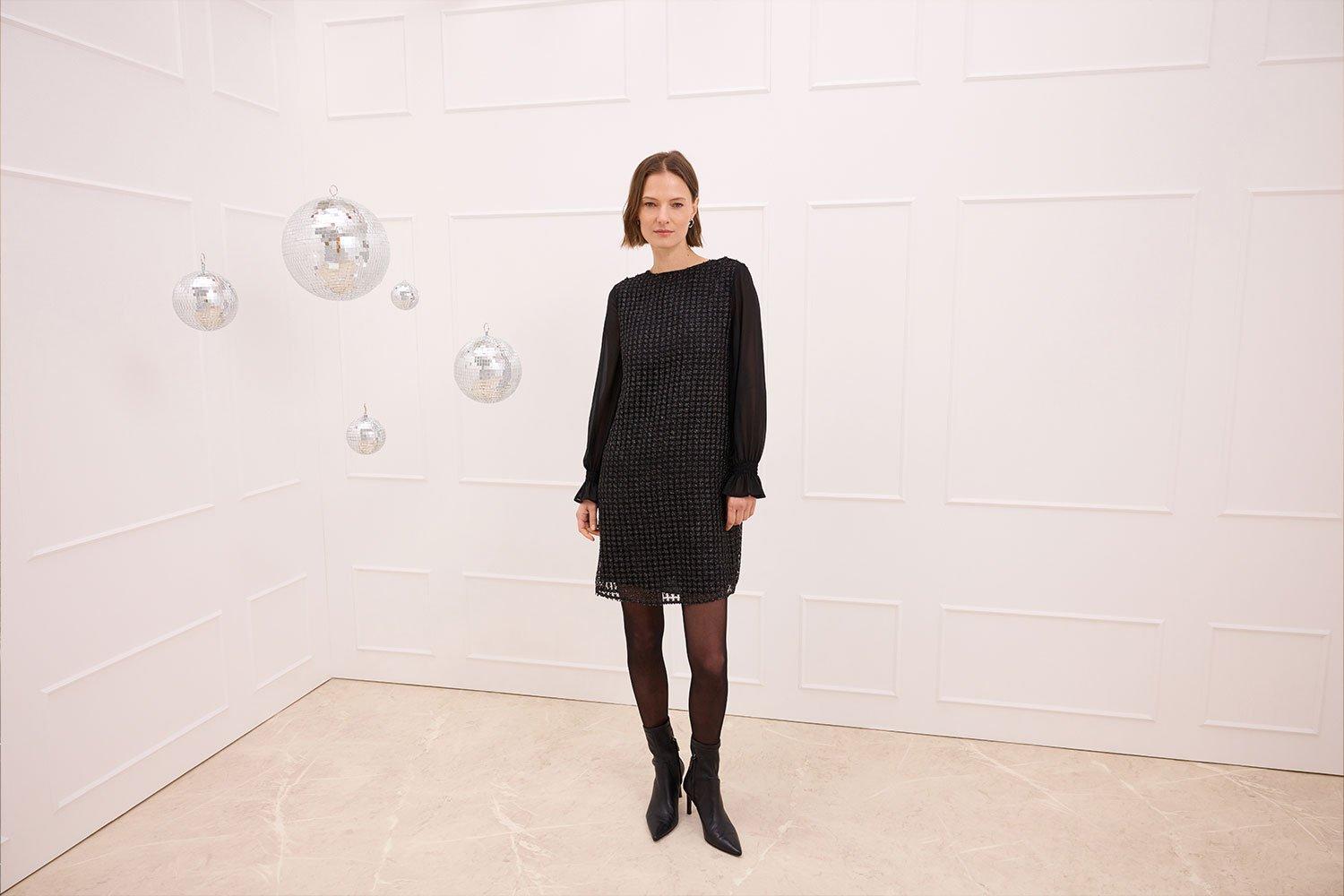 Гламур и изящество воплощаются в этом платье с длинными рукавами из кружева и мерцающей пряжи: 3D-эффект добавляет глубины, а классический крой элегантно подчеркивает фигуру, позволяя вам блистать на любом торжестве или особом вечере, создавая яркий образ и незабываемые впечатления.