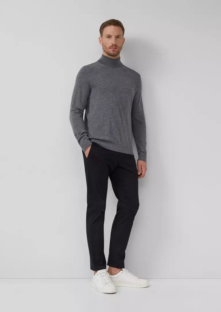 Свитер-водолазка из чистой мериносовой шерсти выполнен изысканной тонкой вязкой и отличается классической посадкой; его мягкая фактура и элегантная рубчатая отделка на воротнике, рукавах и подоле делают этот вариант отличным выбором как для деловых встреч, так и для особых случаев.